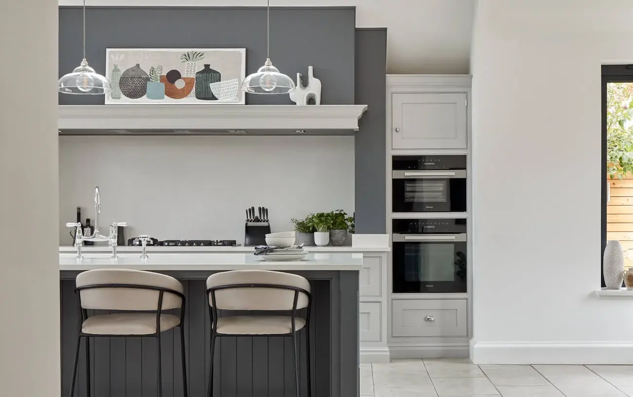 Deze verfijnde licht- en donkergrijze maatwerkkeuken verenigt eigentijdse elegantie met praktische functionaliteit en creëert zo een culinaire en sociale ruimte die jarenlang plezier biedt. Slimme oplossingen, zoals de slanke voorraadkast en de stijlvolle bi-fold drankenkast, zorgen voor overzichtelijke opbergruimte en gemakkelijke toegang tot zowel alledaagse benodigdheden als favoriete dranken. Het royale kookeiland nodigt gasten uit om ontspannen te zitten en te genieten, terwijl de gastheer of gastvrouw heerlijke gerechten bereidt. Het hoge gewelfde plafond geeft de ruimte een indrukwekkend karakter, terwijl de grote glazen deuren aan weerszijden het interieur overspoelen met natuurlijk licht. Deze keuken vormt op elk moment van de dag de perfecte plek om tot rust te komen.